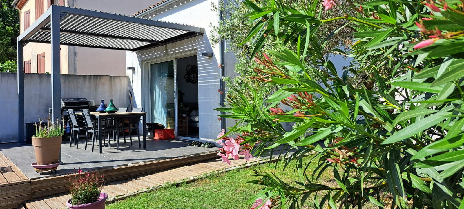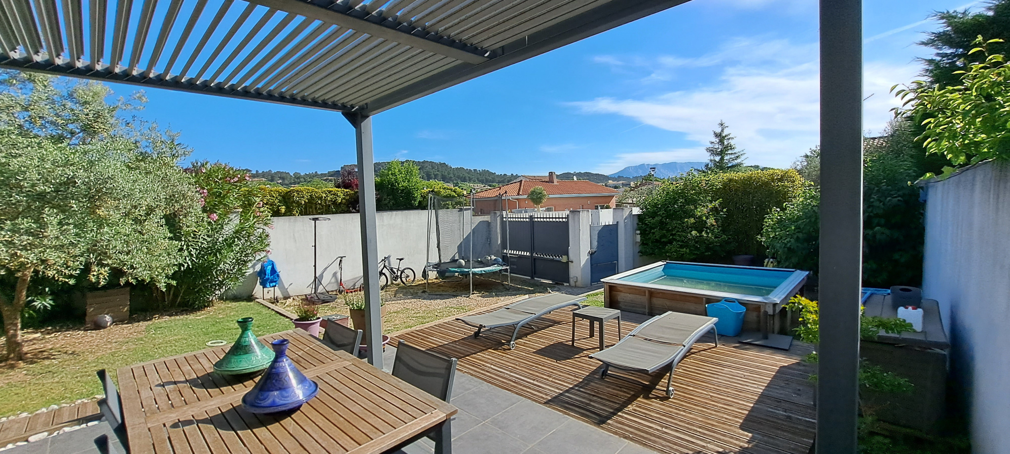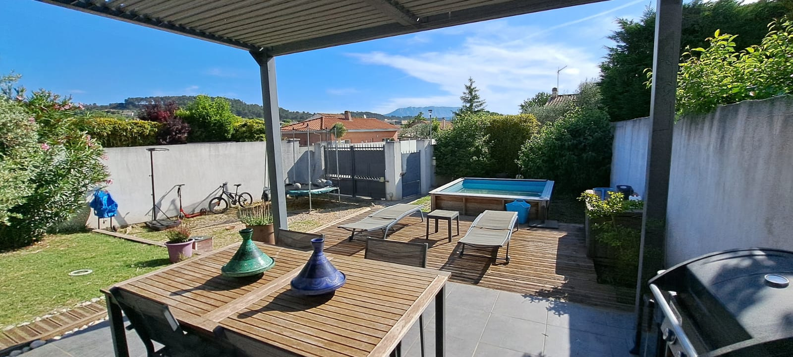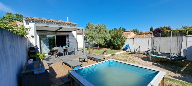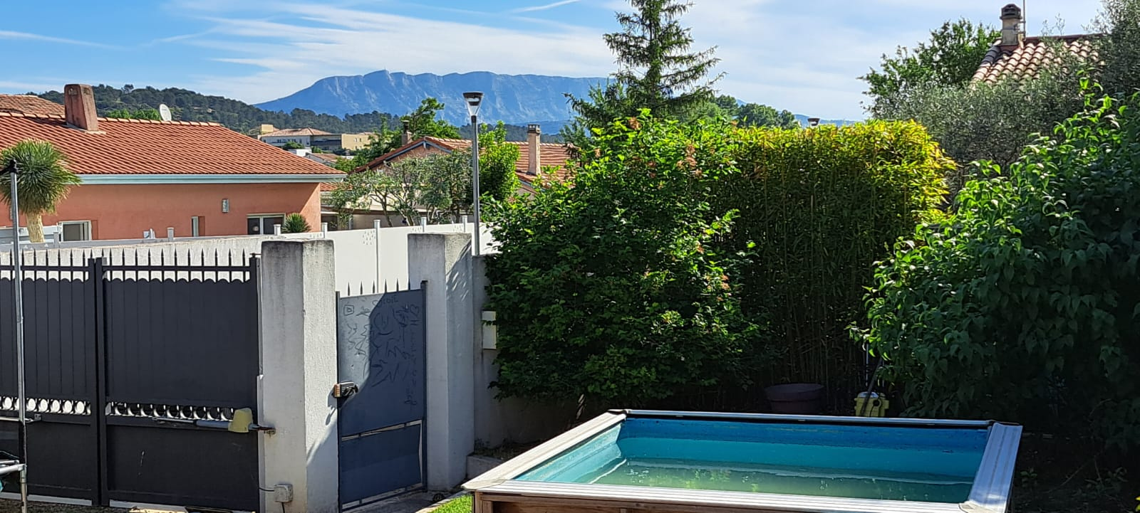 Meyreuil 13590. *** VENDU PAR L'AGENCE *** . Dans un secteur résidentiel, sur une parcelle de 265 m², maison Type 3/4 de 82 m² de plain pied avec une mezzanine mansardée qui peut servir de bureau ou de 3ème chambre. Elle se compose d'une pièce de vie lumineuse avec cuisine ouverte qui donne à l'arrière sur le jardin, d'un cellier, un dégagement, une salle bains avec toilettes et 2 chambres dont une avec dressing. De construction récente, la maison est en parfait état et offre de belles prestations : climatisation réversible dans le séjour, chauffage rayonnant, double vitrage PVC, volets roulants, fibre, WC suspendu, alarme avec vidéo surveillance, forage. DPE en C. A l'extérieur, côté séjour, vous avez une terrasse carrelée avec pergola à lames orientables depuis laquelle vous avez vue sur la Sainte Victoire, un espace vert, une terrasse bois qui borde une petite piscine hors sol (2m X 2m) et possibilité de garer un véhicule à l'intérieur de la propriété. A découvrir au plus vite ! Prix : 395 000 €. Honoraires "charge vendeur" . Mandat Amépi N°1786. RCS 833984529. CPI Marseille-Provence N°1310 2018 000 025 466. Contactez l'agence Bel Art Immobilier au O4 42 54 5O 52 pour plus de renseignements. Les informations sur les risques auxquels ce bien est exposé sont disponibles sur le site Géorisques : georisques.gouv.fr